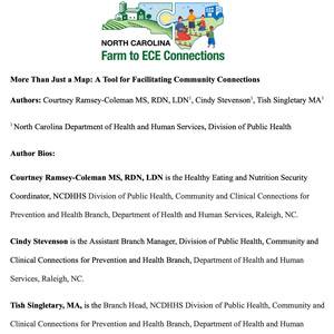 The NC Farm to ECE Connections Map was developed to bridge gaps between farmers and childcare centers, support access to local foods, improve children’s nutrition, and foster meaningful community partnerships. This article also outlines the key steps to creating a community connections map, including data collection, stakeholder input, and sustainable planning, demonstrating how such tools can strengthen local food systems and deepen community ties.